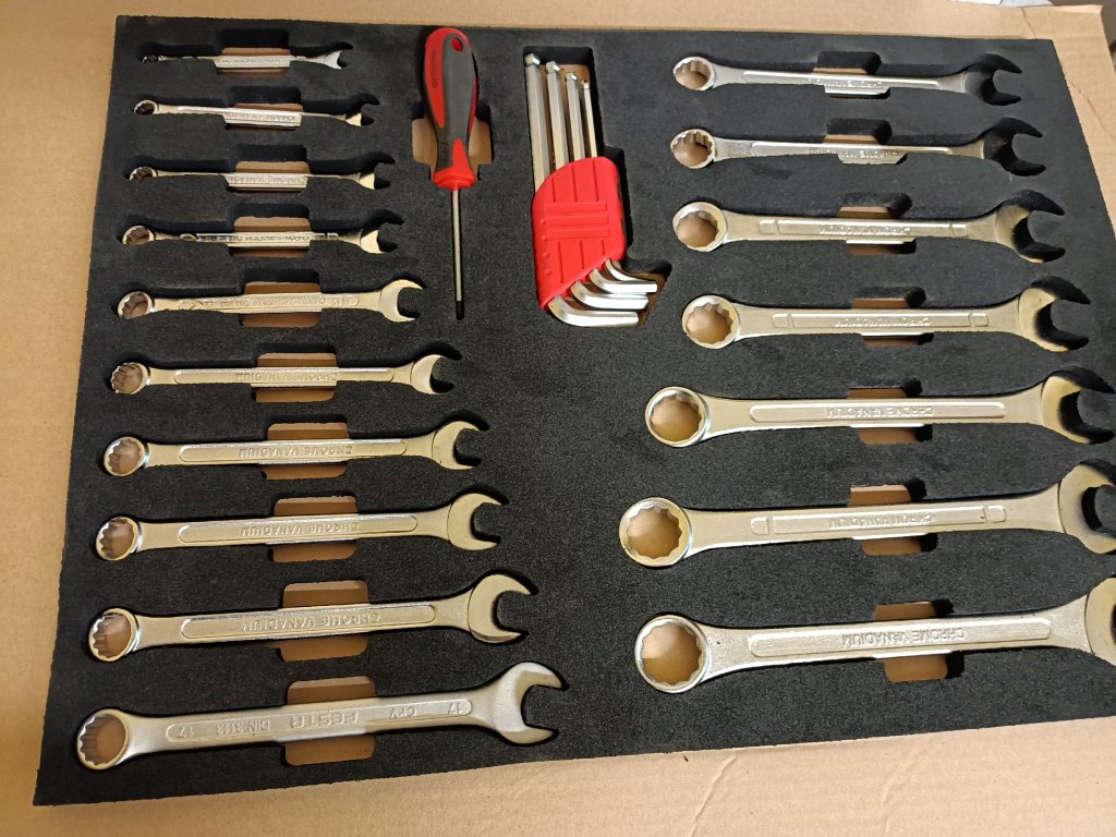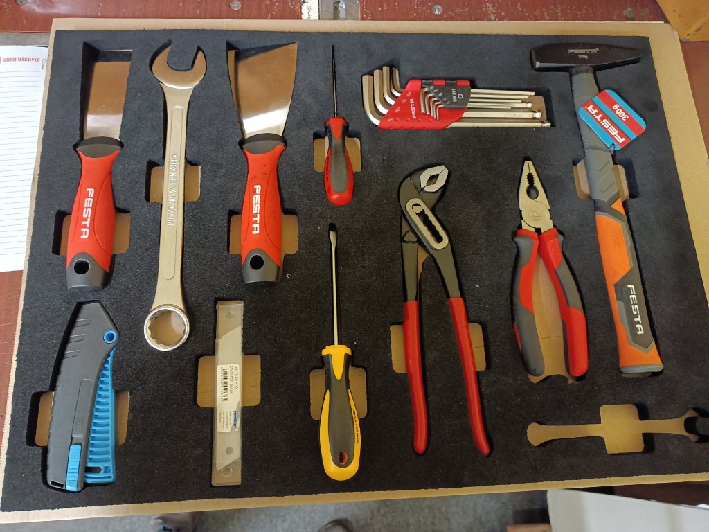 5S uložení nářadí, nástrojů a techniky v přehledném organizéru.